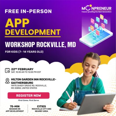 Inviting all parents in Rockville, MD! Moonpreneur is hosting an exclusive free app development workshop for kids on Saturday, Feb 22nd, at 10:30 AM EST.