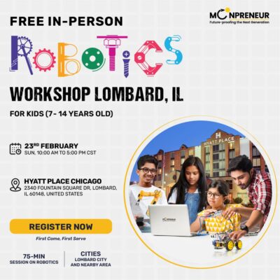 Inviting all parents in Lombard, IL! Moonpreneur is hosting an exclusive free in-person robotics workshop for kids on Saturday, Feb 8th, at 11:00 AM EST.