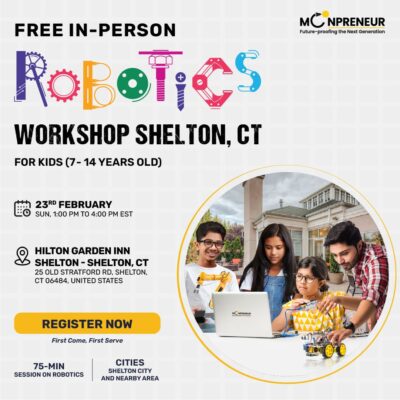 Inviting all parents in Shelton, CT! Moonpreneur is hosting an exclusive free in-person robotics workshop for kids on Sunday, Feb 23rd, at 01:00 PM EST.